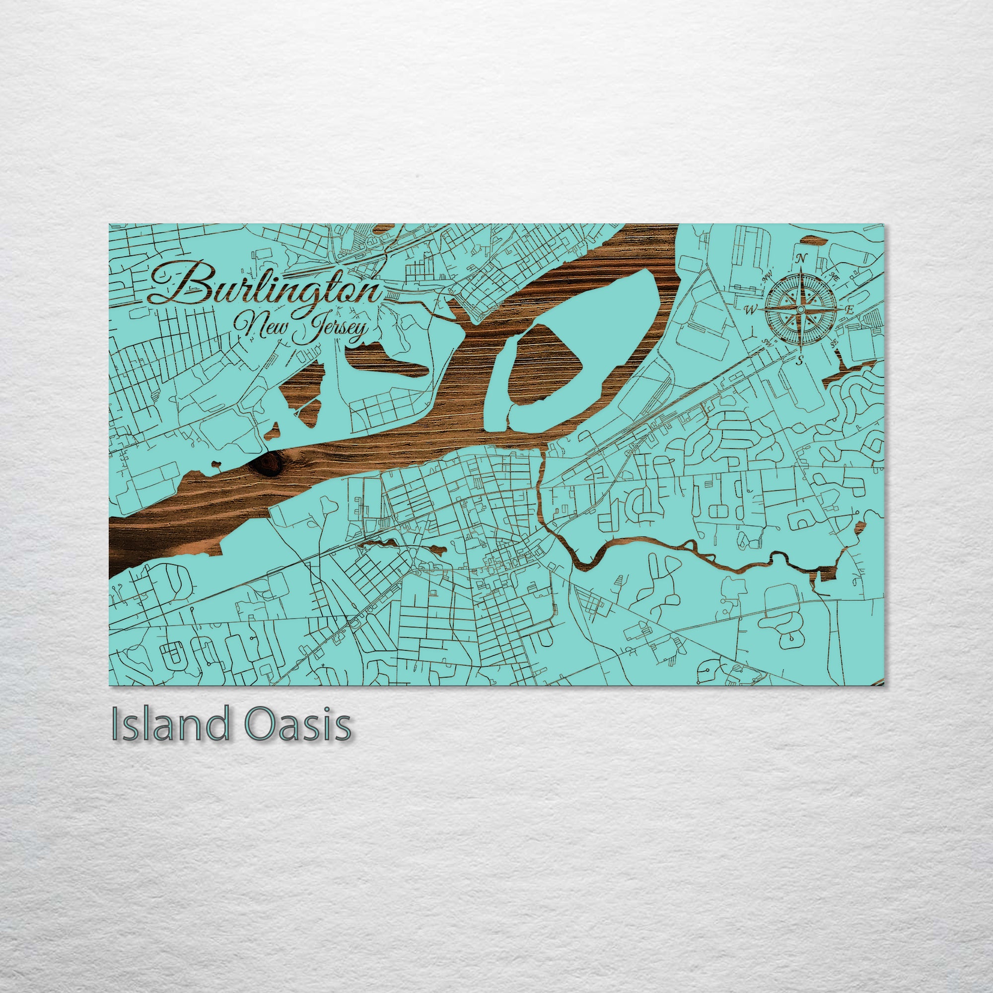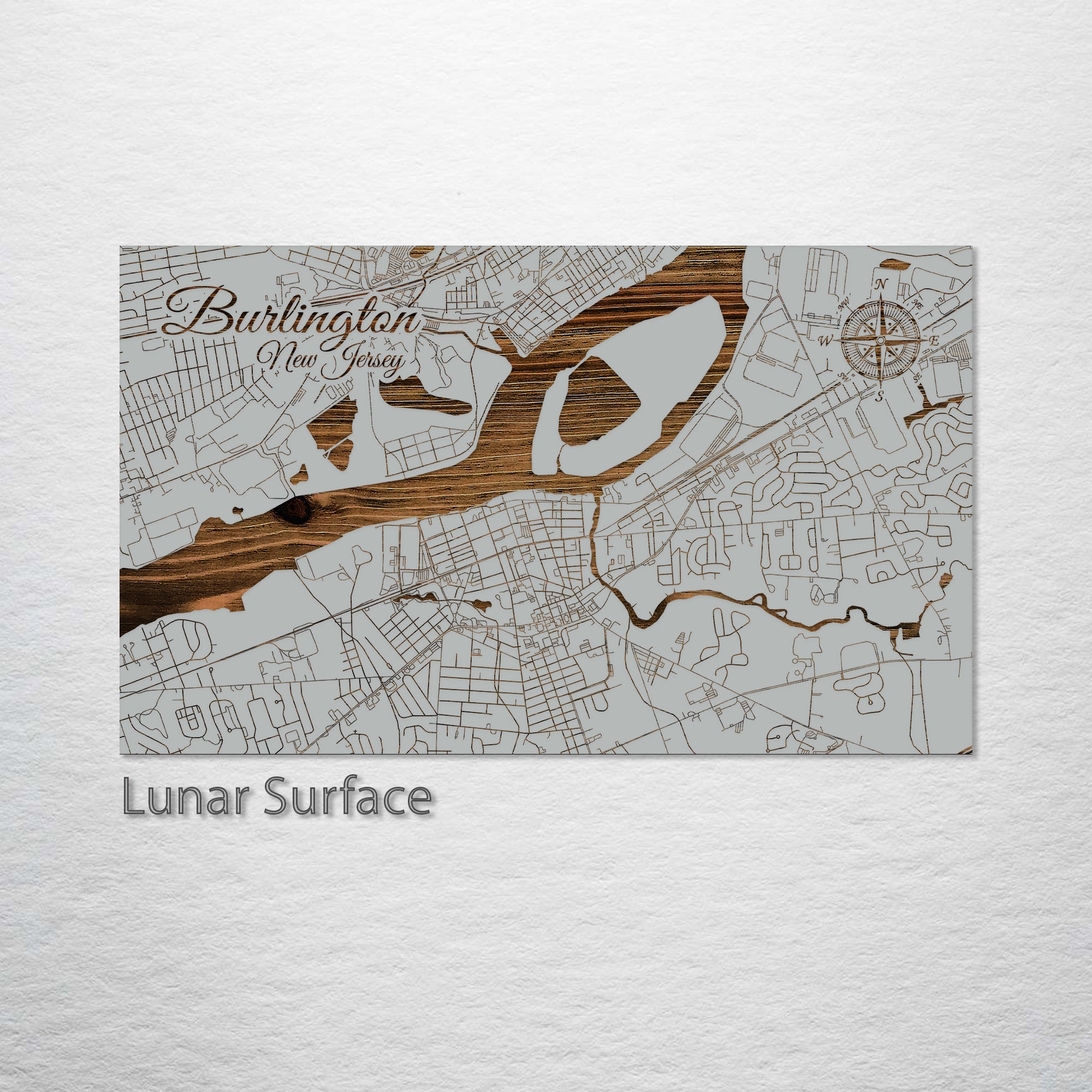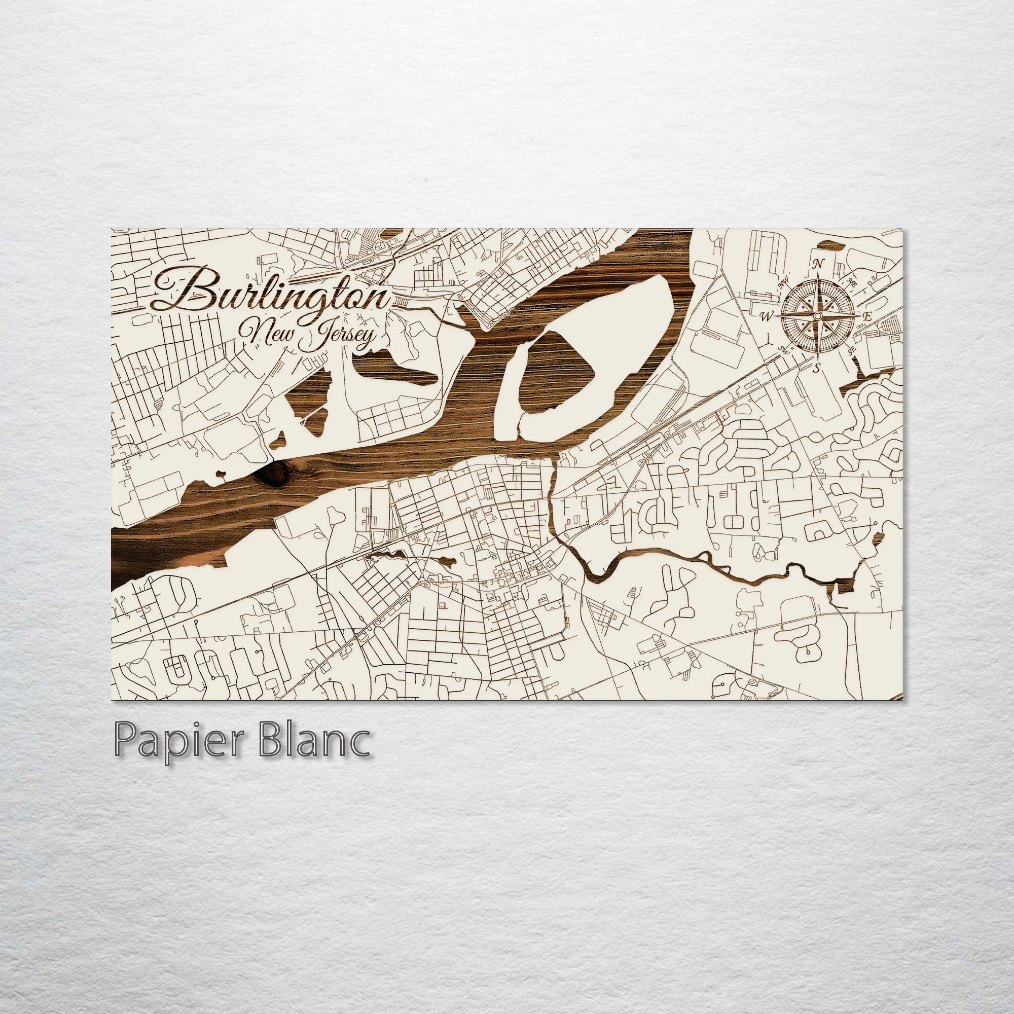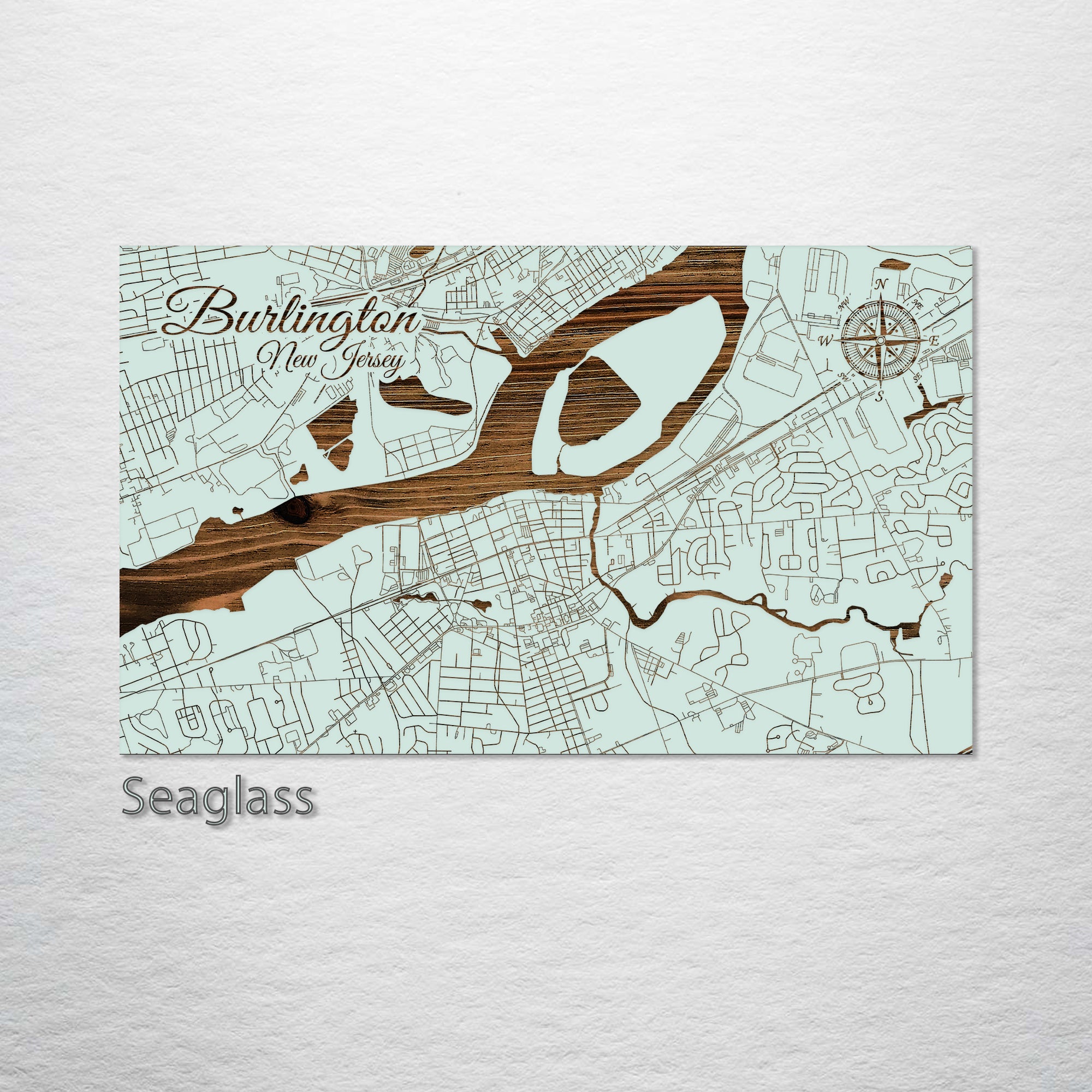 This is a street map of Burlington, NJ designed by Fire & Pine artists.