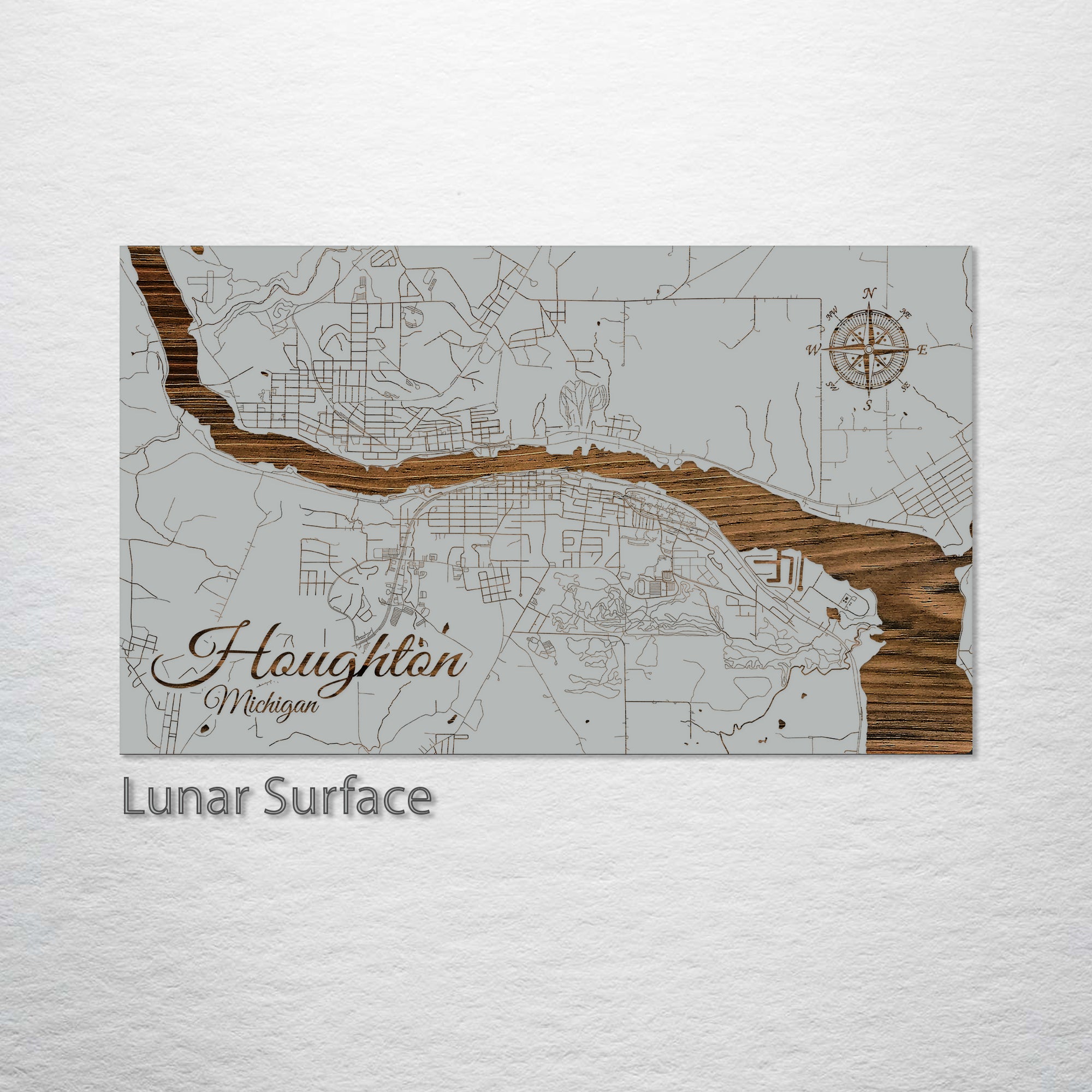 This is a street map of Houghton, MI designed by Fire & Pine artists.