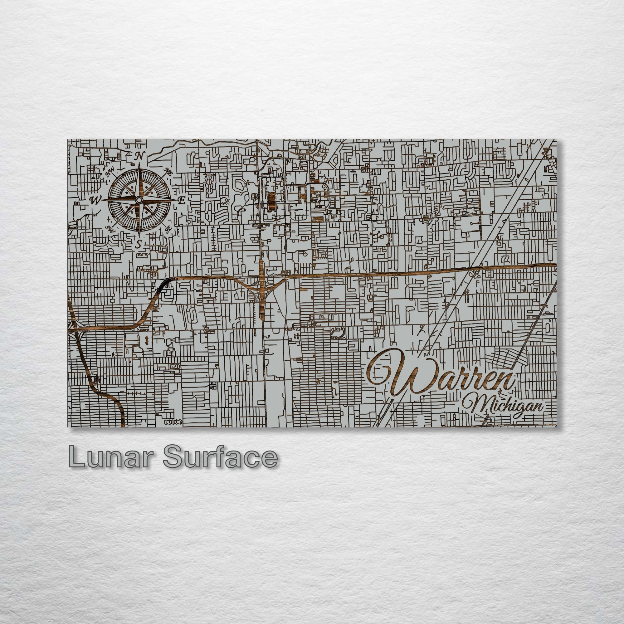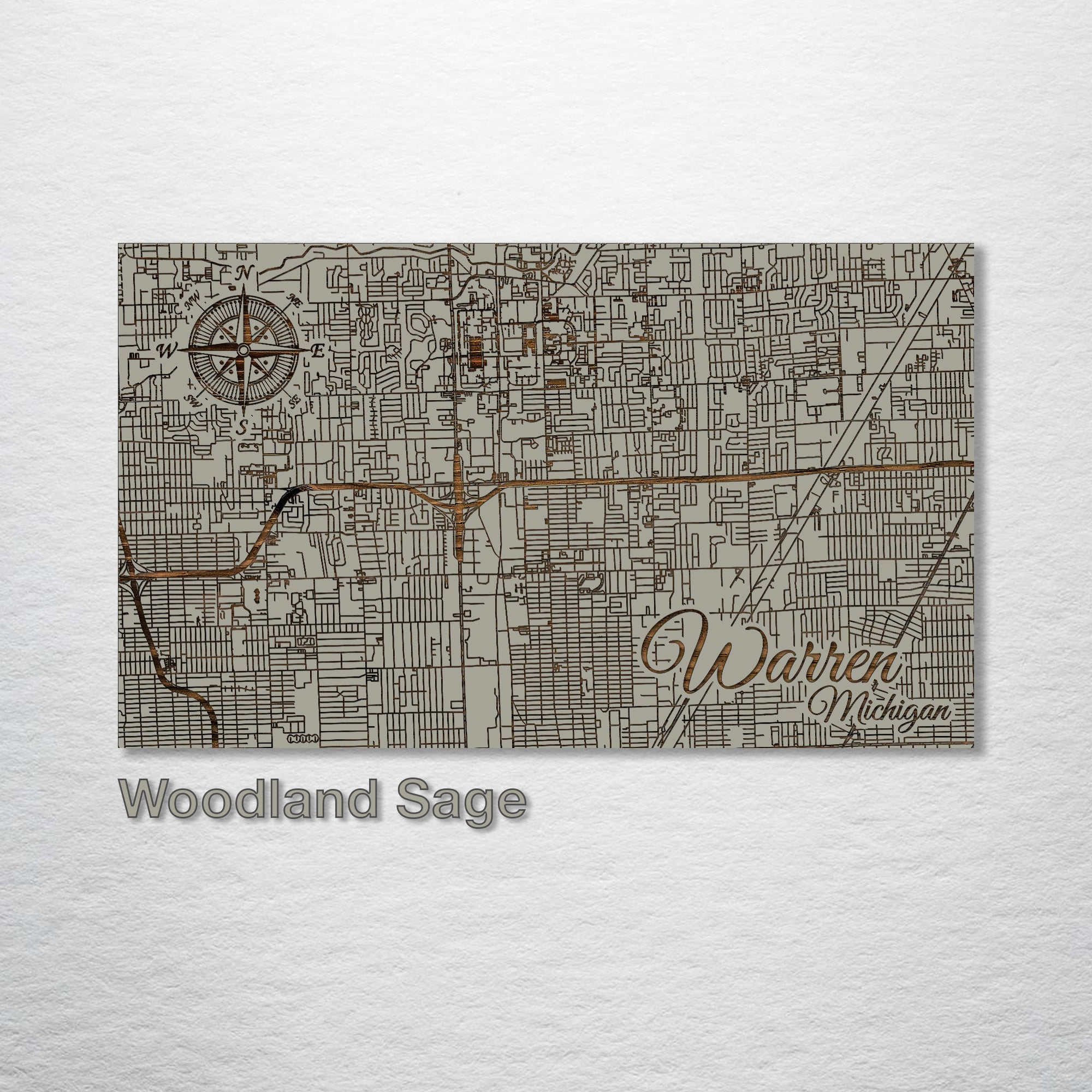 This is a street map of Warren, Michigan designed by Fire & Pine artists.